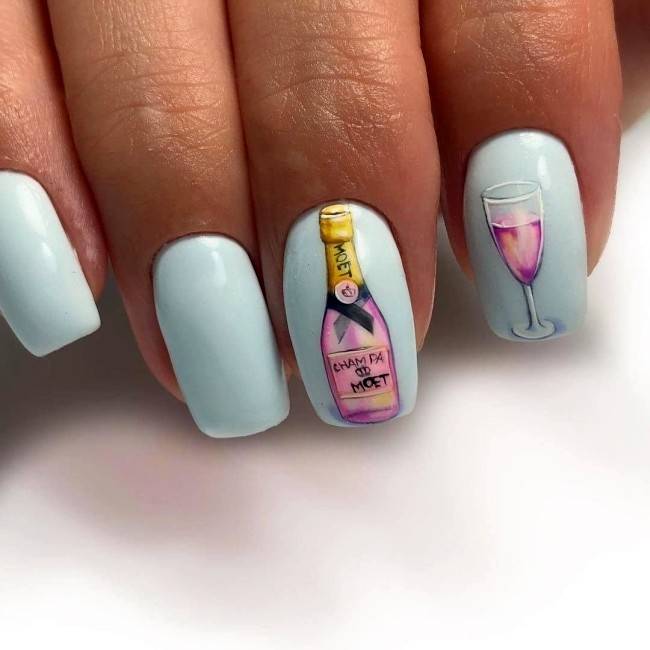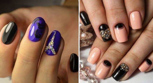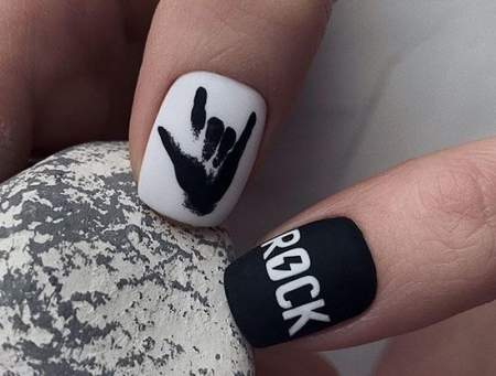 - Акценты в виде наклеек, изображений, художественных композиций на 1-2 пальчиках каждой руки.