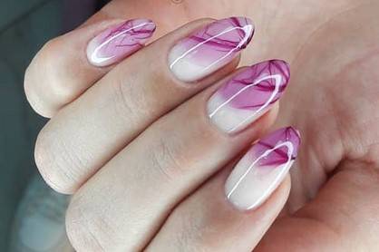 Получить необычные формы и узоры можно с помощью техники «Вуаль». Летний дизайн ногтей позволяет использовать яркие оттенки гель-лаков как для подложки, так и для самой вуали. Красиво сочетается розовая, сиреневая, синяя вуаль с белым, светло-розовым и персиковым цветом фона.