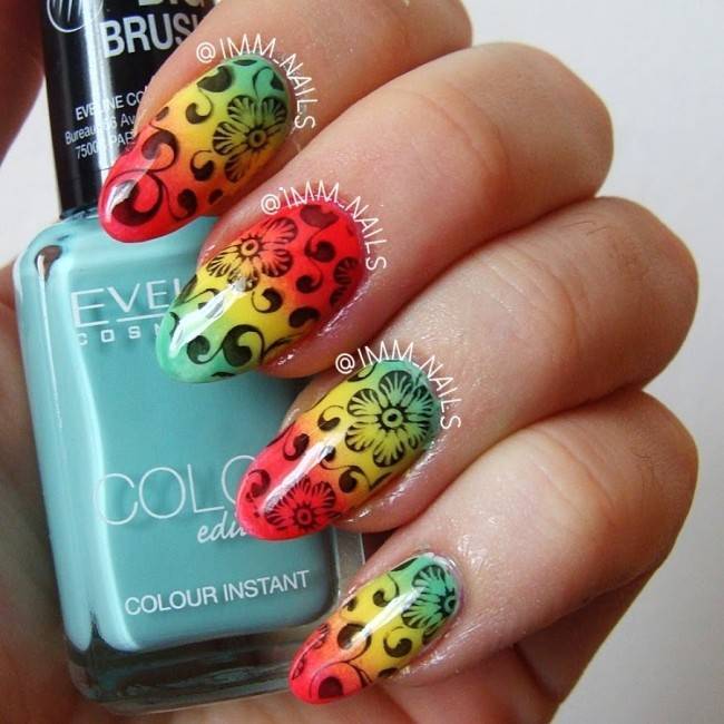 Градиент всегда будет в тренде. А летом сделать яркую, сочную радугу на ноготках – это самое удачное решение. Дополнить такое покрытие можно рисунком или френчем.
