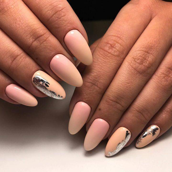 Тренд на естественность и натуральность сохраняется и в жарком сезоне. Нюдовые покрытия, полупрозрачные базы, минимализм в дизайне остаются популярными у девушек. Чтобы бежевый маникюр не выглядел слишком скучно, его нужно дополнить интересным акцентом. Это может быть силуэтный рисунок, капля «жидкого металла», растекшаяся по ногтю на безымянном пальце, несколько блестящих камней необычной формы.