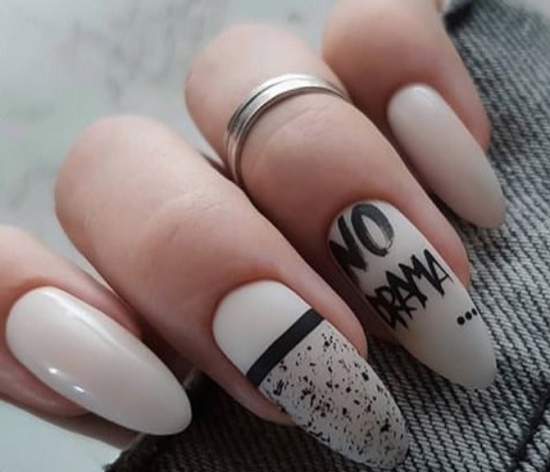 Еще одно модное решение – надписи. Для их создания, как правило, используют черную гель-краску и тонкую кисть. Надпись можно расположить сверху фонового рисунка, дополнить блестками, «островками» из переводной фольги, линиями разной толщины.