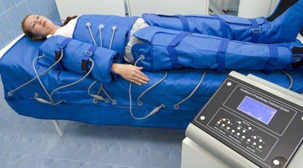 - прессотерапия – воздействие осуществляется сжатым воздухом, то есть, предполагает давление. Для этого на участках тела закрепляют специальные повязки или одевают костюм. Программное обеспечение позволяет регулировать силу и очередность сжатия с тем, чтобы добиться улучшения крово- и лимфотока;