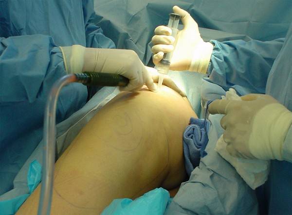 Стоит сразу отметить, что данный способ считается самым травматичным и устаревшим. При проведении операции происходит большое повреждение подкожных тканей и соответствующая им кровопотеря. Влажная липосакция отличается от сухой лишь тем, что зона операции заранее обкалывается анестетиком.
