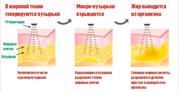 Ультразвуковая — представляет собой расщепление липидов путём ультразвукового воздействия. После этого продукты расщепления выводятся через лимфатические протоки. Подобную процедуру можно сопоставить с измельчением камней в почках.