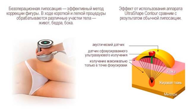 Безоперационный метод липосакции живота предполагает стерильность процедуры, исключение инфицирования, так как на жировые клетки идет воздействие с внешней стороны прибором. Врач с помощью ультразвукового аппарата разрушает жир, а ткани и органы не повреждаются.