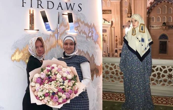 Слева: Лиза Пескова и Айшат Кадырова рядом с вывеской ее модного дома одежды для мусульманок Firdaws. Справа: Лиза Пескова в хиджабе