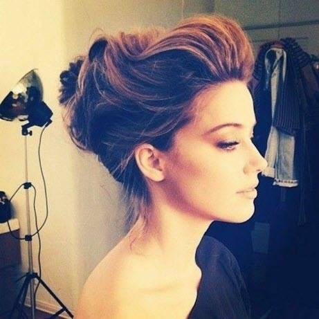 Оригинальная собранная прическа с челкой подойдет девушкам, чья длина волос доходит до плеч. Идеальный вариант для жаркой погоды: с такой укладкой будет легко и прохладно. Прическу можно делать и на вечерние мероприятия.