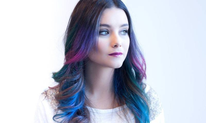 - На русых, черных и каштановых красиво будут смотреться яркий фиолетовый, бирюзовый и зеленый с синим цвета.