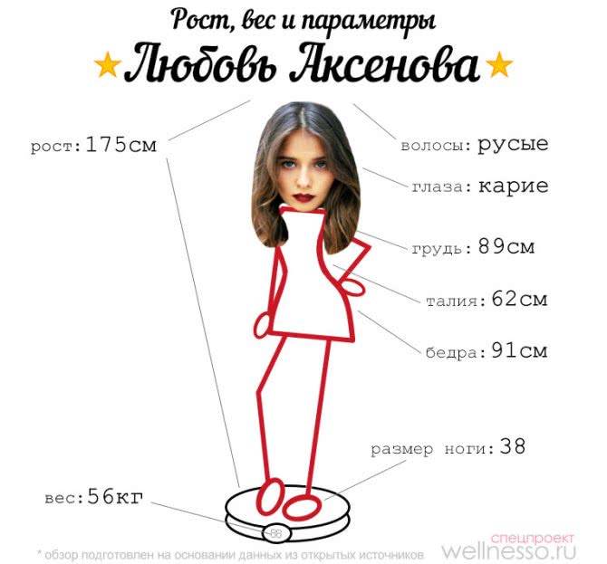В повседневной жизни почти не красится, даже на кастинги не делает макияж. Если же идет на встречу с друзьями или в кафе, то выделяет брови, выравнивает кожу и наносит румяна. Рост Аксеновой 175 см, а параметры – приближенные к идеалу 90-60-90.