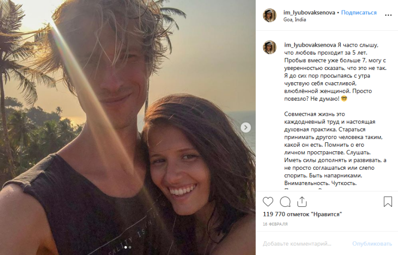 Любовь не скрывает от своих поклонников секреты счастливого брака, выкладывая на своей странице в Instagram рассуждения на эту тему. Она часто слышала, что любовь между супругами остывает примерно за пять лет, но прожив вместе с Павлом вот уже более семи лет, она может с уверенностью сказать, что это не так. Она до сих пор чувствует себя счастливой и влюблённой, да и муж часто говорит ей слова любви.
