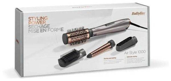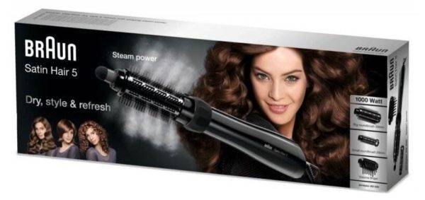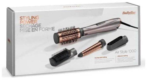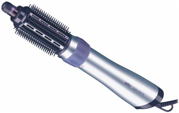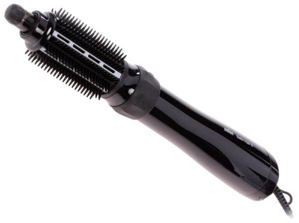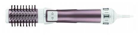 Устройство входит в список лучших фен-щеток для волос. Оно имеет мощность 100 Вт. Фен быстро сушит волосы и придает прическе нужную форму. В комплект включено четыре насадки с разными параметрами. Локоны дополнительно ионизируются и могут быть обработаны холодным воздухом. Помимо сушки и укладки фен позволяет делать завивку. Корпус выполнен из пластика. Внутри круглой щетки находится мотор переменного тока. Производитель предусмотрел два режима работы. Поверхность щипцов выполнена из керамики. Вес устройства слегка превышает 500 г.