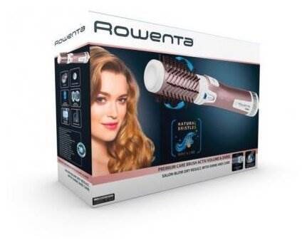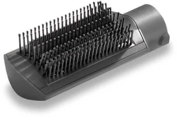 Фен-щетка оснащена двигателем мощностью 1000 Вт. Запатентованная система подачи воздуха и вентиляции позволяет ей справляться не только со слегка влажными, но и с мокрыми волосами. Температуру можно регулировать. Она придает объем от самых корней и обеспечивает быструю и качественную укладку. Комбинация ворсистых и нейлоновых щетинок разной направленности делает прическу воздушной.