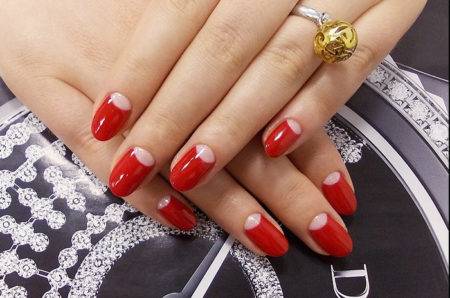 В этом варианте, на ногти наноситься основной (красный) цвет. После чего по верхней границе лунулы закрепляется стикер. Далее лунула закрашивается в белый цвет. Как только гель-лак просохнет в УФ лампе, наноситься финишное покрытие, которое придаст ногтям особый блеск и устойчивость к внешним воздействиям.