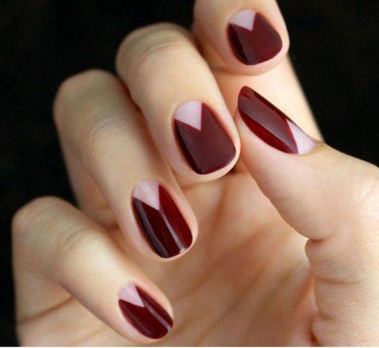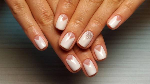 Посмотрите на фото – лунный маникюр шеллаком может быть треугольным.