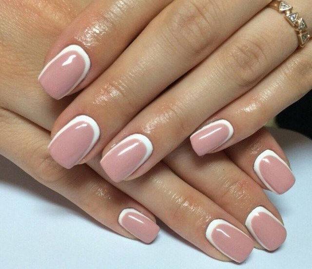 Обычно для такого маникюра берут два контрастных лака, один из которых белый — им рисуют кайму. Часто можно встретить бело-розовое или красно-белое сочетание, но не исключены и другие комбинации. В последнее время стало популярным использовать для контурной полоски золотистый или серебристый лак.
