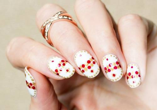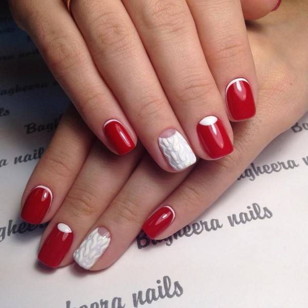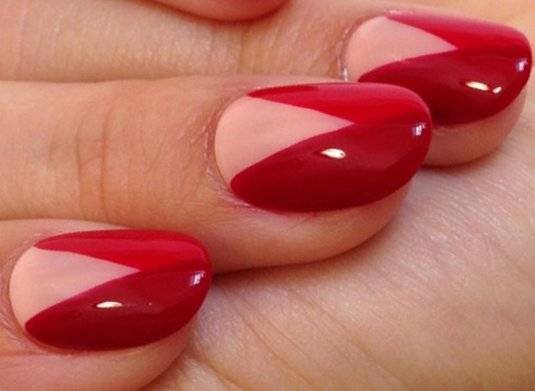 Классикой, уместной в любой обстановке, признан маникюр с красной основой. В этом случае лунку делают телесной или белой. Сочный декор получается из яркого содержимого двух флакончиков, взятого в равном соотношении. Лунку не выделяют, а всю окрашенную пластину в конце работы покрывают прозрачным закрепителем.
