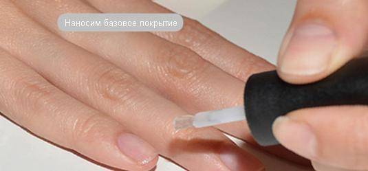 3. Первый слой на каждом ноготке создайте при помощи базового покрытия. Тщательно проработайте кончики и область возле кутикулы. Просушите ноготки.