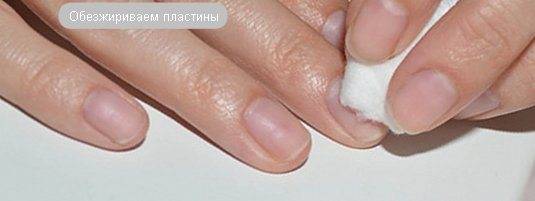 - Обезжирьте ногти борным спиртом или обезжиривателем.