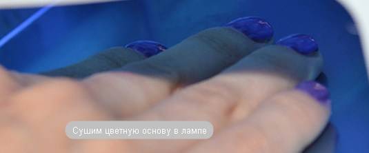 - На полимеризованную базу нанесите цветное покрытие. Просушите его под лампой. Нанесите второй слой, также просушите.