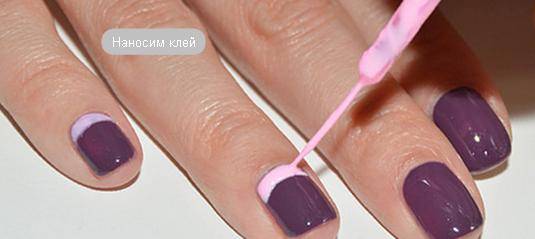 - Возьмите тонкую кисточку, наберите на неё клей для фольги, и прорисуйте им область края ногтя и лунки.