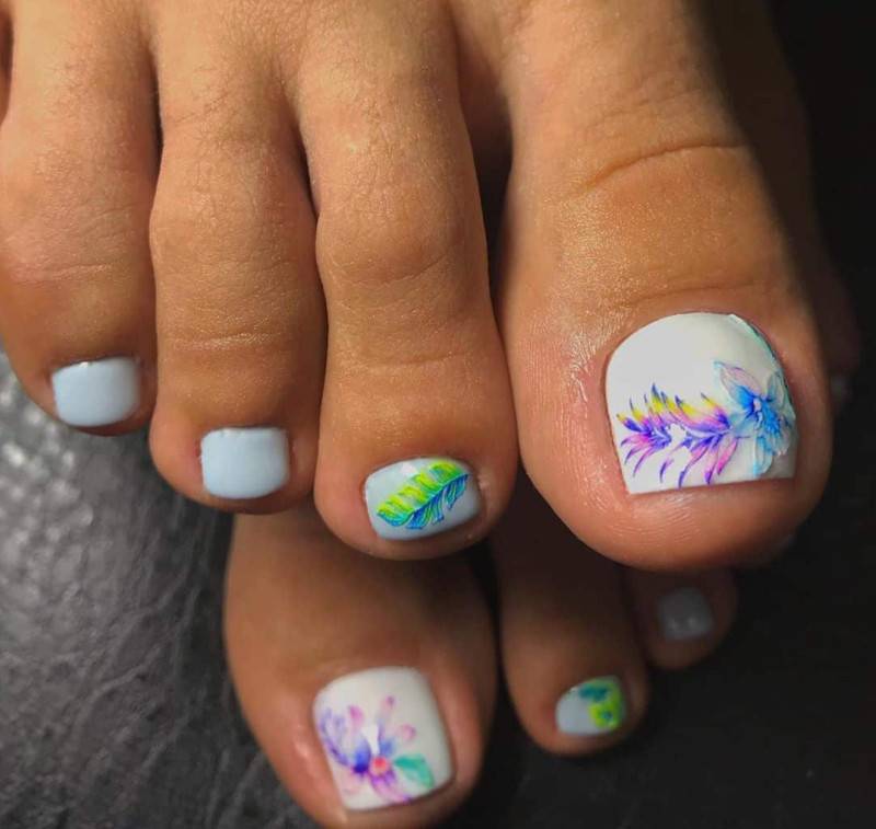 Наклейки тем более упрощают работу мастера или модницы, желающей создать педикюр в светлом или ярком оттенках с цветочными мотивами. Здесь всё также просто – читаете инструкцию – крепите наклейку – покрываете ногти топом. Уникальный педикюр с матовым покрытием или в классическом стиле готов!