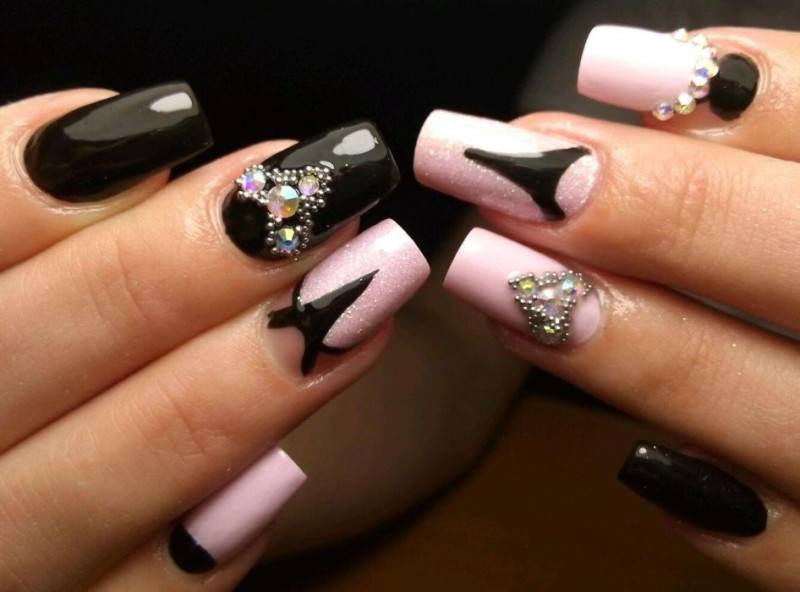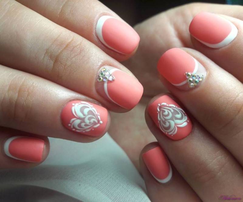 Можно создать из камней имитацию ожерелья поперек ноготка или дополнить стразами рисунок цветов или вензелей. Ниже на фото дизайн со стразами.
