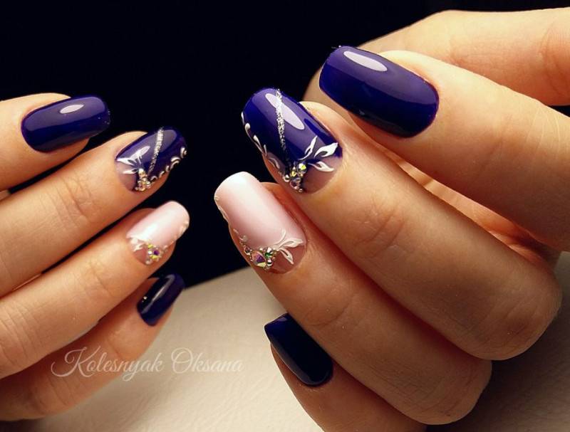 Переливы камней непременно привлекут внимание окружающих. Как правило, из страз создаются орнаменты и узоры в зоне кутикулы или в одном из нижних углов ногтевой пластины большого пальца. Можно создать из камней имитацию ожерелья поперек ноготка или дополнить стразами рисунок цветов или вензелей