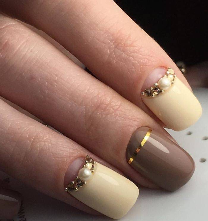 Мелкие объемные шарики бульонки можно использовать для создания на ногтях имитации ювелирных украшений. Инкрустацию выполняют на больших ноготках. Для светлого педикюра можно использовать как контрастные бульонки (серые, черные, темно-синие), так и декор пастельных тонов (бежевого, розового, перламутрового).