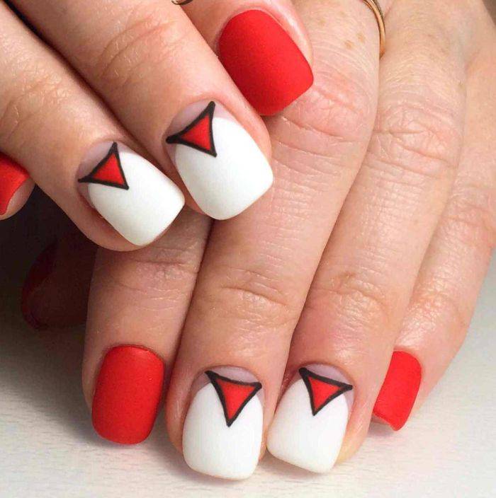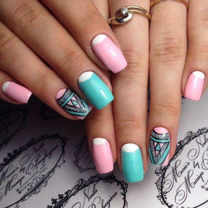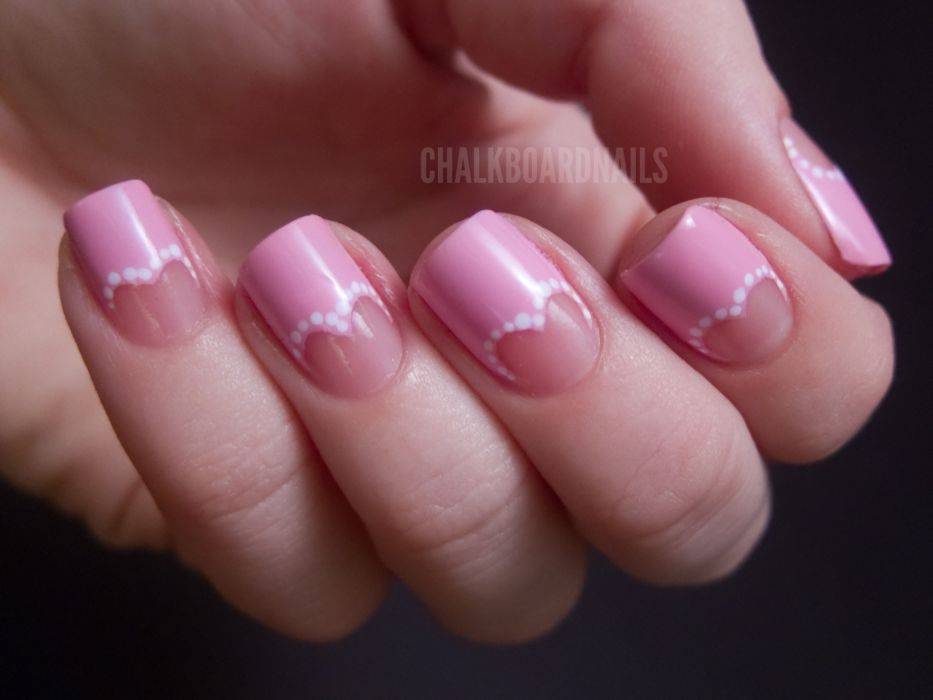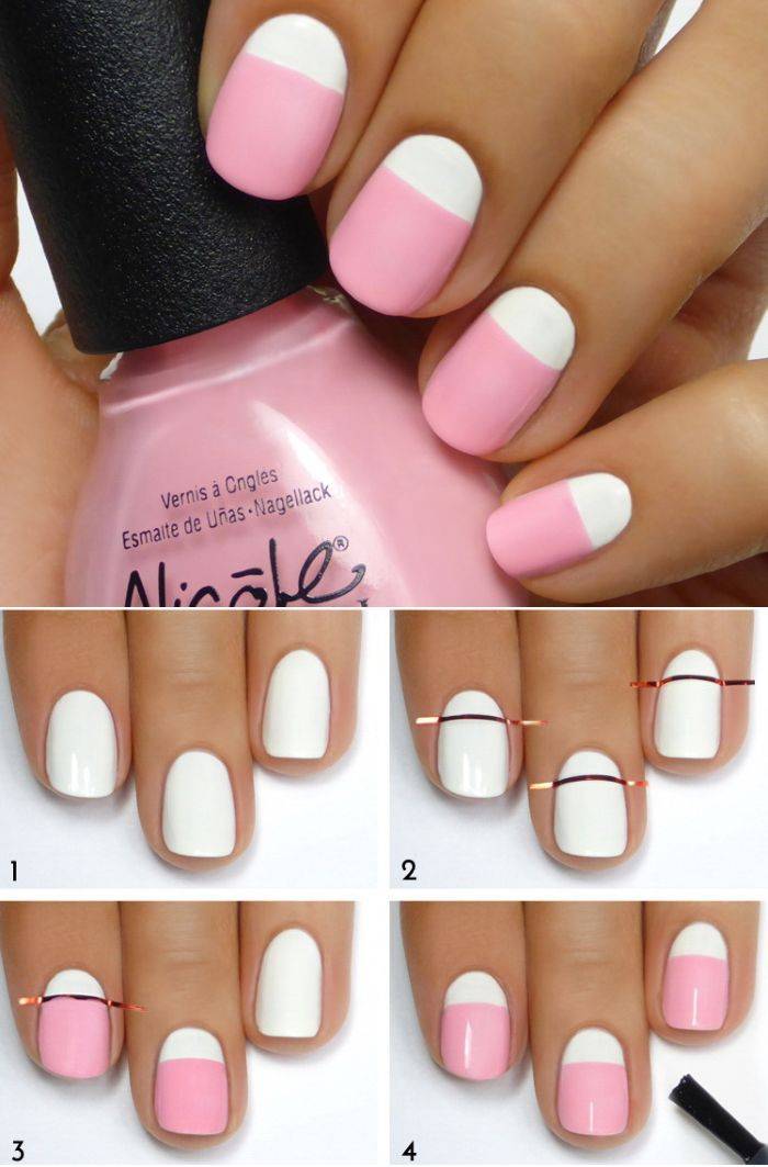 Обычно для такого маникюра берут два контрастных лака, один из которых белый — им рисуют кайму. Часто можно встретить бело-розовое или красно-белое сочетание, но не исключены и другие комбинации. В последнее время стало популярным использовать для контурной полоски золотистый или серебристый лак.