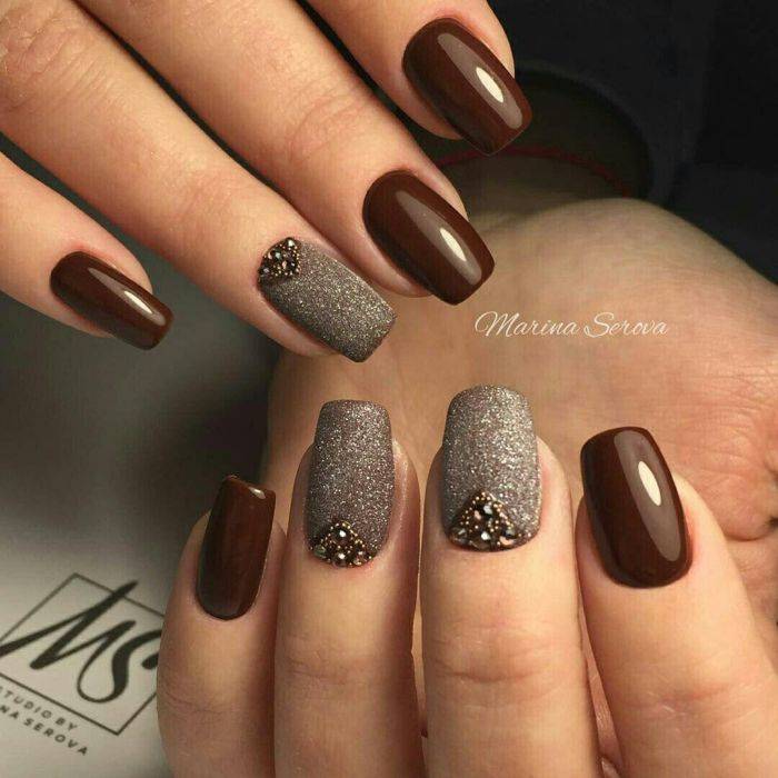 Можно создать из камней имитацию ожерелья поперек ноготка или дополнить стразами рисунок цветов или вензелей. Ниже на фото дизайн со стразами.
