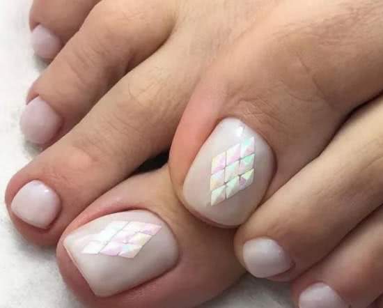 стразы. В ансамбле с монохромным светлым маникюром элегантно будут смотреться один-два центральных, блестящих камня нежных оттенков на больших пальцах ног. Сногсшибательное декорирование зоны кутикулы, либо «улыбки» френча стразами, используется, как правило, для торжеств и важных мероприятий;