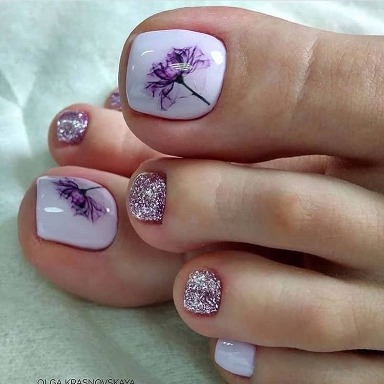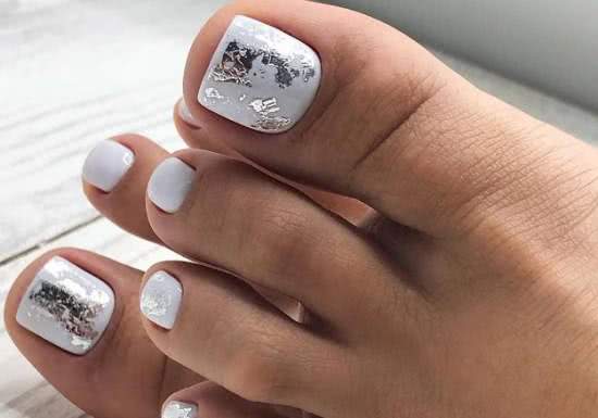 Серебристый, золотой и голографический глиттер может стать красивым дополнением светлого педикюра. В отличие от педикюра со стразами, глиттер не добавляет дизайну объема, а значит он более практичен и удобен в носке. С помощью глиттера можно создать плавный переход цвета на ногтевой пластине или покрыть им выборочно 1 – 2 ноготка.