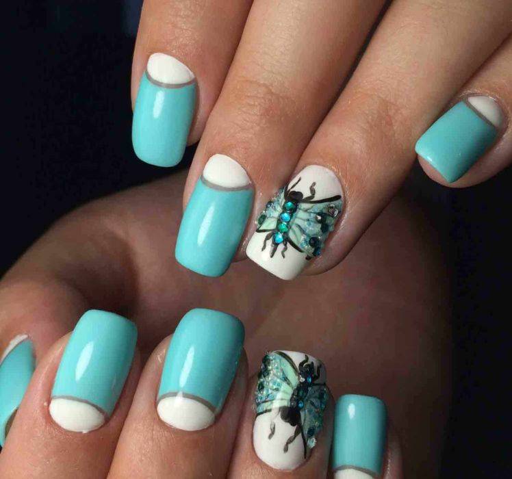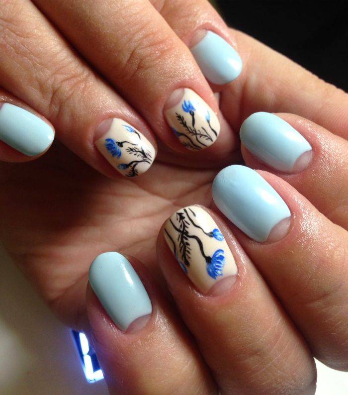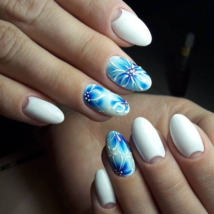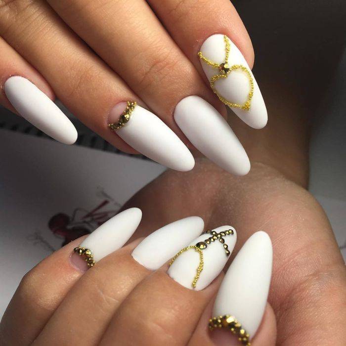 Дизайны ногтей со светлым покрытием не стоит перегружать множественными элементами декора. Благодаря богатой фактуре цвета, одно большое, яркое, акцентное пятно украшений смотрится гораздо выгоднее нескольких мелких.