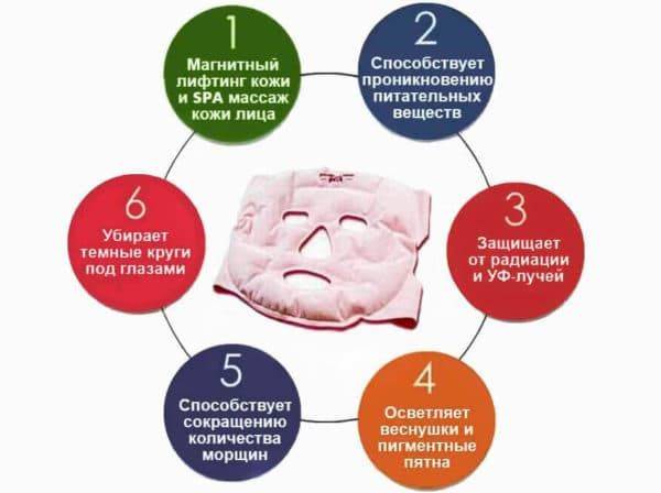 В зависимости от формы выпуска, маска воздействует точечно или на всю поверхность лица. Она создает магнитное поле, которое стимулирует и ускоряет все процессы.