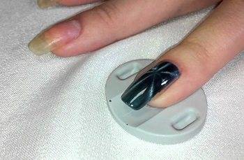 - После нанесения последнего слоя лака к ногтевой пластине следует поднести магнит или магнитную насадку и выдержать 20–30 сек. Нужно помнить, что обычный лак довольно быстро застывает на открытом воздухе, поэтому каждый палец обрабатывается магнитом сразу после нанесения основного цвета.