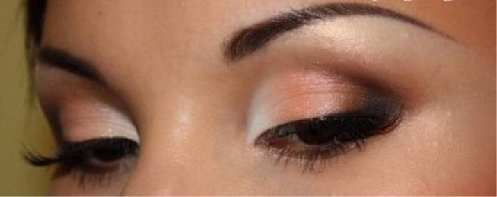 В складку верхнего века накладывают тени телесного или светло-серого цвета. Переход между оттенками не должен быть резким, а потому все границы подвергаются растушёвке. Нижнее веко с уже начерченной на нём тёмной линией окрашивают тенями светлых или телесных тонов с эффектом мерцания.