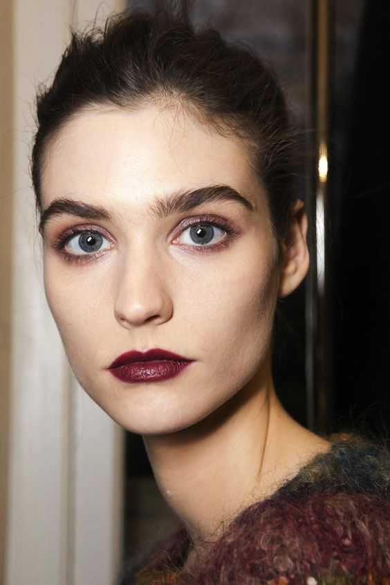 Яркие ягодные оттенки, матовый бордовый или даже черный — для самых смелых. Такие помады в моде, в сочетании с ровным тоном лица и широкими бровями они смотрятся восхитительно.