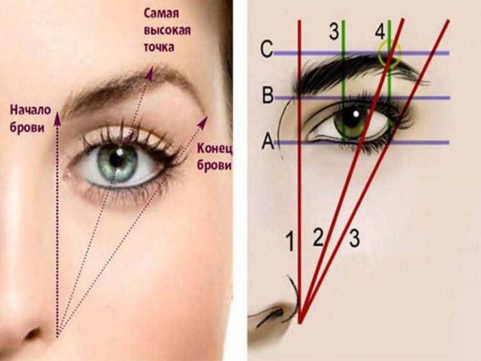 Общая позиция формирования бровей базируется на трех линиях, проведенных с уголка носа: