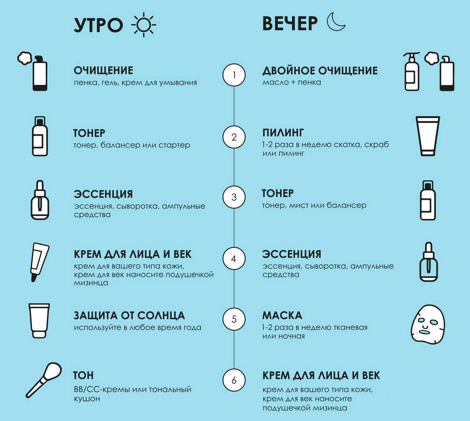 Первые средства, которые нужно использовать утром — это очищающий тоник, гель или пенка для умывания. Они снимают жирный блеск и очищают поры. Затем лицо увлажняют, используя крем с пептидами или гиалуроновой кислотой.