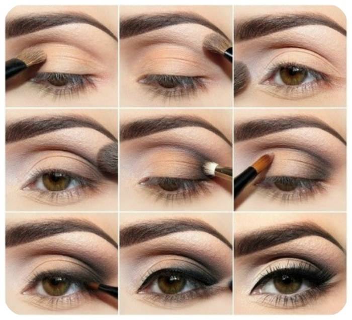 - подготовьте кожу и лицо, воспользуйтесь флюидом и базой под макияж, нанесите тон и румяна, а затем приступайте к глазам;