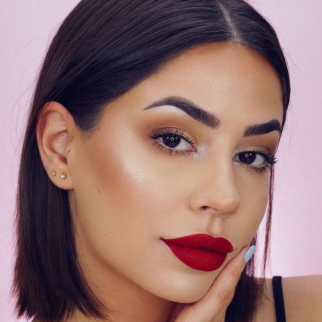 Темноволосым красавицам не годится помада в светлом цвете. Чересчур бледный тон «съедает» губы на фоне насыщенного цвета локонов. Подходящий выбор – это цвет бордо, красный или малиновый. Для создания объема обведите контур и добавьте блеск. Устранить мелкие раздражения, недочеты кожи поможет основа, корректор и пудра.