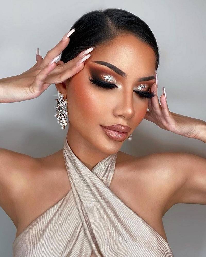 - С макияжем глаз можно немного пофантазировать и добавить красок: девушкам с более тёмной кожей подойдут золотые, фиолетовые, коричневые, тёмно-зелёные и серые тени; светлокожие могут использовать нежную серебристо-жемчужную гамму, беж, розоватые оттенки;