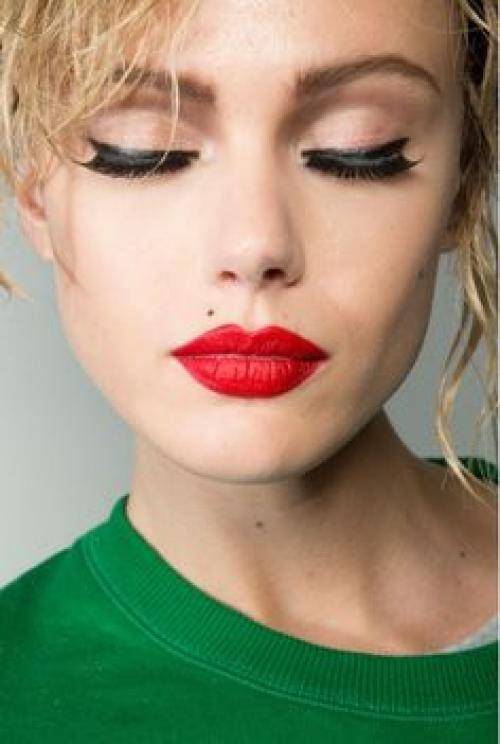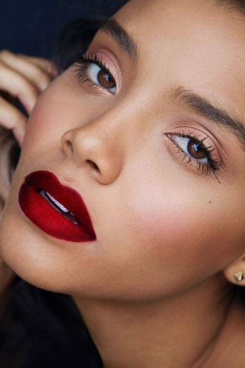 При этом помада с блеском визуально увеличит объём губ, матовая же, наоборот, уменьшит их. Используя красную помаду, лучше сделать ее единственно ярким акцентом на вашем лице, поэтому стоит отказаться и от ярких теней. Само же лицо также нужно «избавить» от всевозможных дефектов, иначе красный только подчеркнет их.