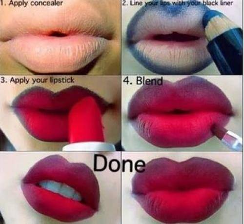 Кстати, в последнее время особенно актуален макияж с красной помадой, которая переходит от темного оттенка к светлому. Такой эффект-омбре на губах достигается очень просто: нужно губки обвести черным карандашом, после нанести помаду, а затем при помощи кисти «растянуть» цвет.