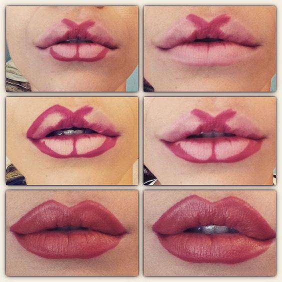 - светлая линия между двумя темными поможет добавить губам объем и сексуальную припухлость;