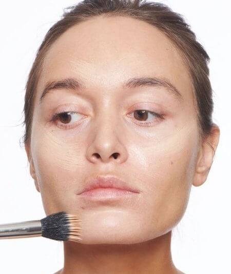 Легкими движениями нанесите тональный крем специальной кисточкой. Если вы поклонница другой текстуры – вы можете заменить его и другим средством.
