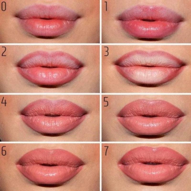 светлая часть может располагаться на стыке губ, что подчеркнет форму и визуально увеличит ее; окрашивание темной помадой в районе смыкания рта уменьшает форму, но подчеркивает белизну зубов; сверху темный оттенок, на нижней губе светлый поможет акцентировать внимание на верхней части; для выделения нижней части необходимо делать комбинацию светлого тона сверху и светлого с переходом в темный снизу