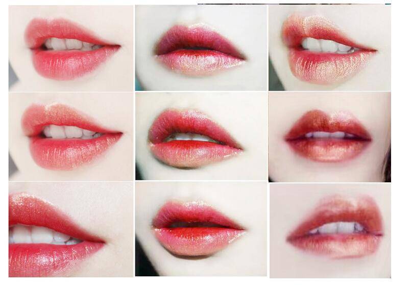 светлая часть может располагаться на стыке губ, что подчеркнет форму и визуально увеличит ее; окрашивание темной помадой в районе смыкания рта уменьшает форму, но подчеркивает белизну зубов; сверху темный оттенок, на нижней губе светлый поможет акцентировать внимание на верхней части; для выделения нижней части необходимо делать комбинацию светлого тона сверху и светлого с переходом в темный снизу