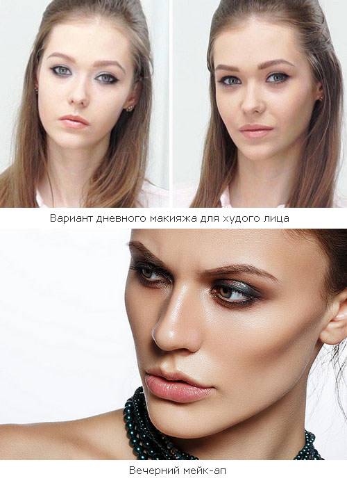 В зависимости от того, куда вы собираетесь – на работу или торжественное мероприятие, – выбирайте и стиль макияжа. При коррекции худого лица косметикой обязательно нужно учитывать освещение. Обычно вечерний мейк-ап создаётся в более ярких красках, дневной – в более сдержанных. Пошаговая техника выполнения и того, и другого поможет вам сориентироваться в этих нюансах.