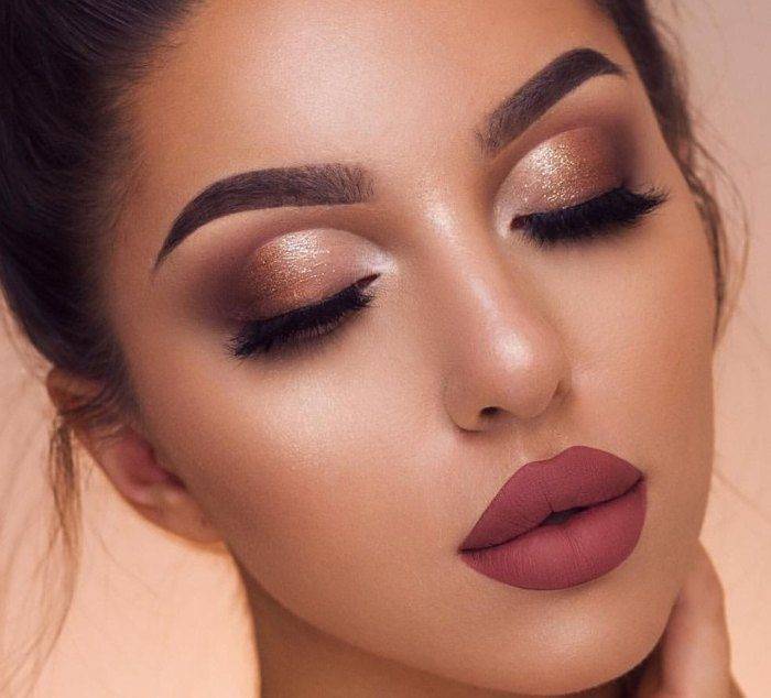 Девушкам с более смуглой кожей подойдут оттенки коричневого и бежевого. Вы можете попробовать использовать тени с легким перламутровым блеском. Они не испортят ваш внешний вид, а сделают образ более нежным и легким. Можно также дополнить макияж интересными блестками, украшающими лицо.